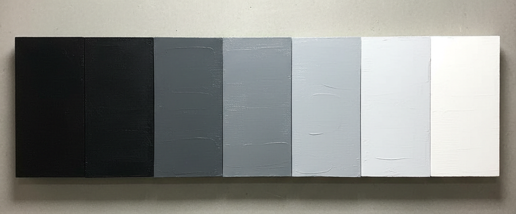 - Draw a series of five (or nine) adjacent boxes and paint from pure black through grays to pure white.