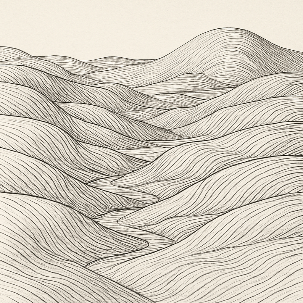 Hatching is a drawing technique using series of parallel lines to represent shade, texture, and form. In landscape art, hatching—or its variant, cross-hatching—helps convey the vastness, contours, and textures of natural scenes through line direction, density, and spacing.